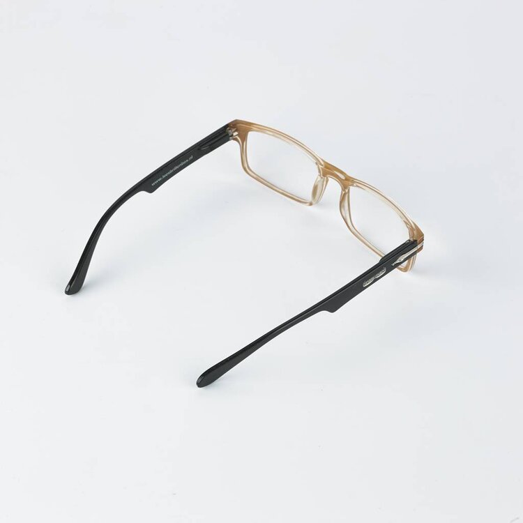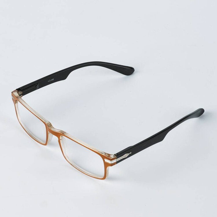 Lunettes de lecture brunes | 14,5 cm de large sur 3,5 cm de haut à l'avant. Longueur de la branche approximativement 15 cm, fabriquée en plastique. La puissance de votre choix est indiquée à l'intérieur de chaque paire de lunettes. |